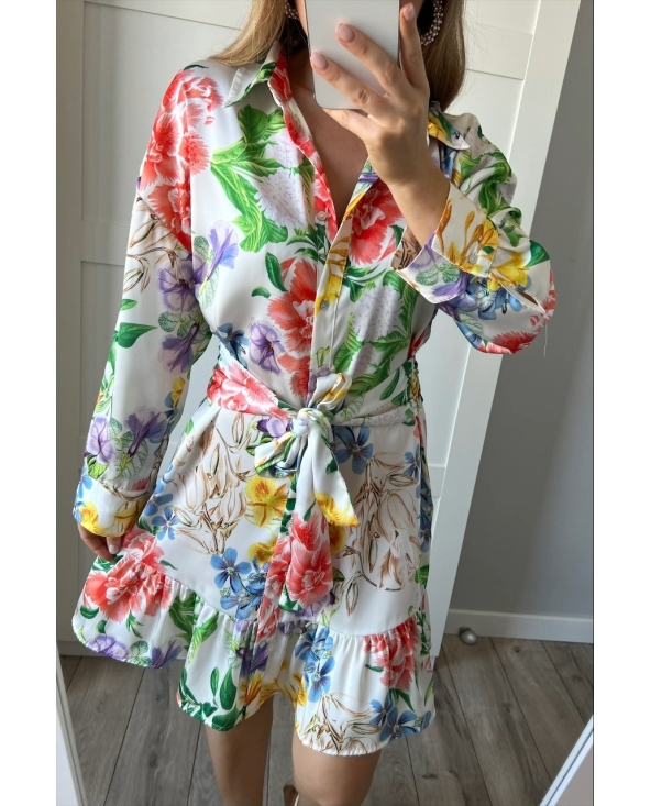 Satynowa koszulowa sukienka w kwiaty z wiązaniem